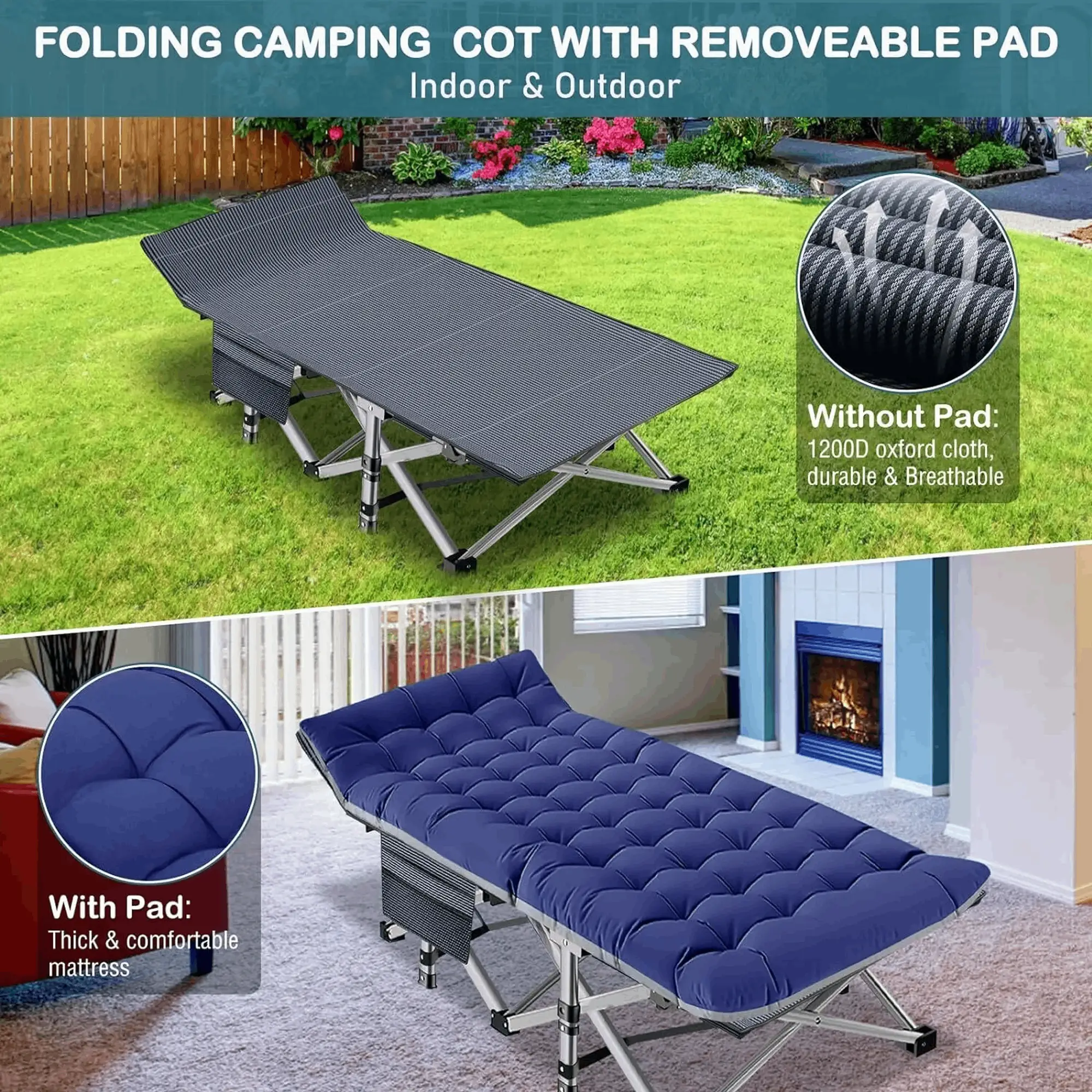 ❀:Adults camp cots bed is made of a 25mm square anti-rust steel frame, durable 1mm thickened tubing, and double layer 1200D Oxford cloth. Maximum load capacity of 800lbs.